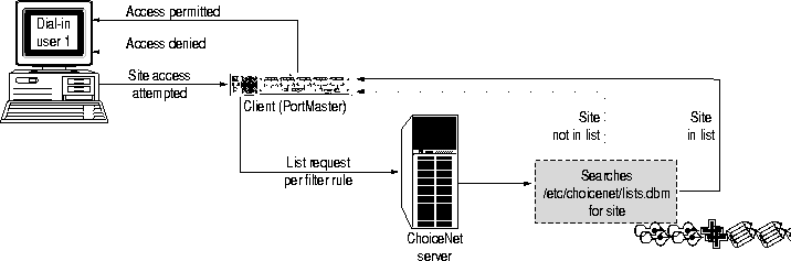 The ChoiceNet server searches the /etc/choicenet/lists.dbm directory and notifies the PortMaster of the results. If the site is not in the list, then the rule does not match. If the site is in the list, the rule is matched and its action-permit or deny-is taken.