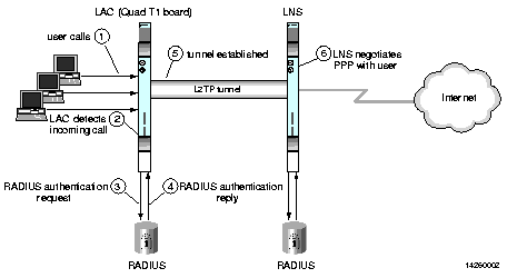 3. Using call-check, the LAC sends an authentication request to a RADIUS server containing the Called-Station-Id and Calling-Station-Id before answering the call. (See "Overview of Call-Check" on page 9-8.)